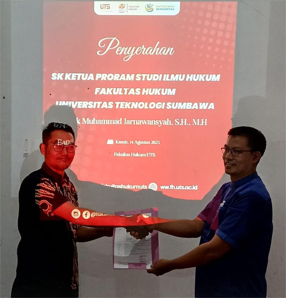 Sumbawa, Jum’at 15 Agustus 2025 – Fakultas Hukum Universitas Teknologi Sumbawa (UTS) melaksanakan kegiatan penyerahan Surat Keputusan (SK) Ketua Program Studi Ilmu Hukum kepada Bapak Muhammad Jarnawansyah, S.H., M.H. Acara tersebut berlangsung di Aula Fakultas Hukum UTS dengan suasana khidmat dan dihadiri oleh jajaran pimpinan fakultas, dosen, serta tenaga kependidikan. Pada Kamis, 14 Agustus 2025 […]