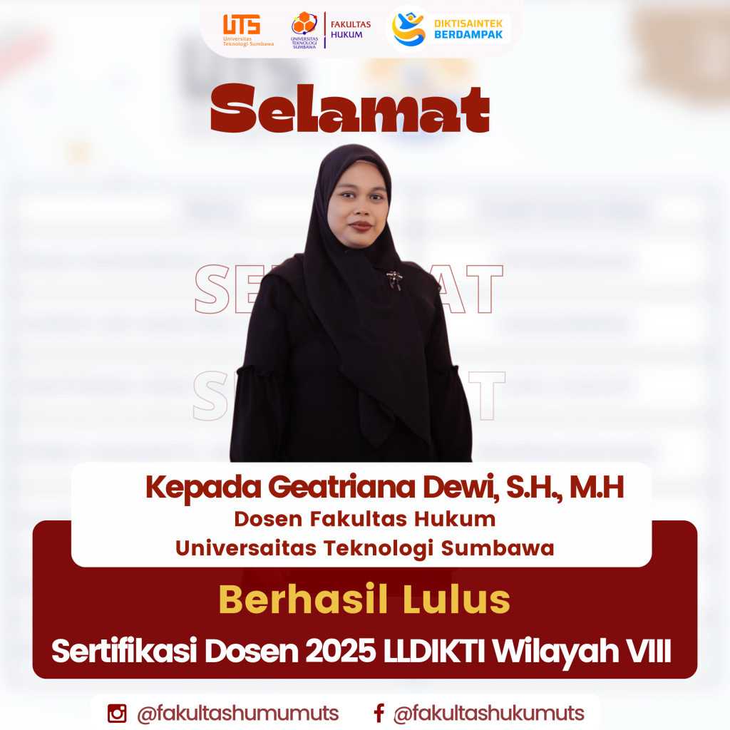 Sumbawa Besar, 24 September 2025 – Fakultas Hukum Universitas Teknologi Sumbawa (UTS) kembali menorehkan capaian membanggakan. Salah satu dosen muda, Geatriana Dewi, S.H., M.H., dinyatakan berhasil lulus Sertifikasi Dosen Tahun 2025 yang diselenggarakan oleh LLDIKTI Wilayah VIII. Sertifikasi dosen merupakan bentuk pengakuan profesional terhadap kompetensi, dedikasi, dan kinerja dosen dalam melaksanakan Tri Dharma Perguruan Tinggi. […]
